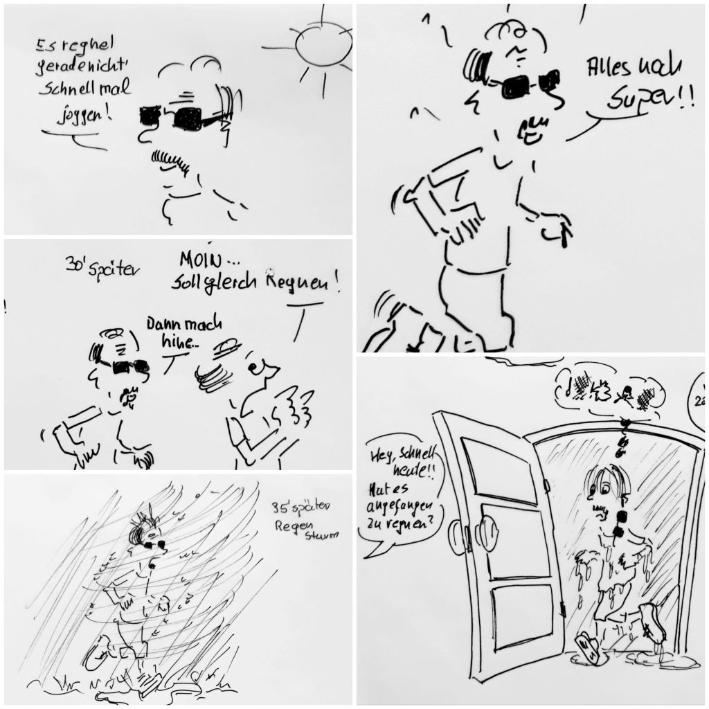 Hallo, bin heute morgen, bei meinem täglichen Strandlauf vom Regen überrascht worden. Wie das aussah, habe ich in einigen Karikaturen festgehalten. Die Laufsachen trocknen noch in der Dusche. Euch allen noch einen wunderbaren Tag. (Zeichnung: cartulli 4/23 – CCC Cuxhaven-Cartoon-Center – Die Storyfactory)