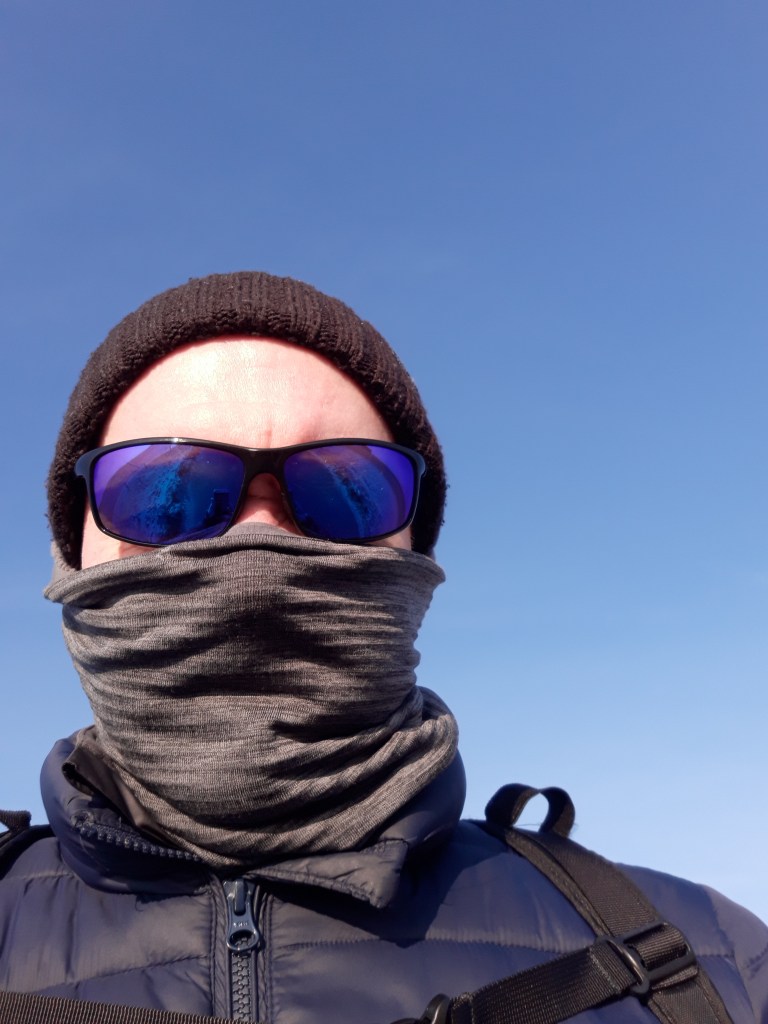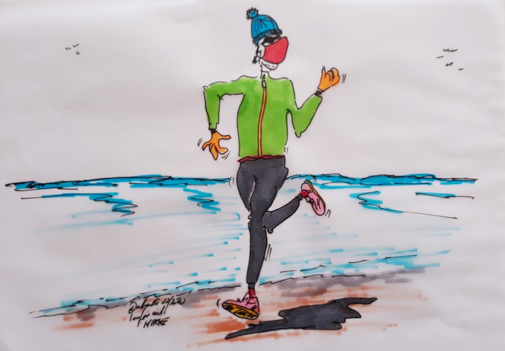 Ich laufe mit einem Multifunktionstuch, einmal, um den Hals warm zu halten, um ab und zu auch den Kopf zu schützen bei viel Wind (hier am Meer weht es immer kräftig) und außerdem um meine Nase zu schützen, vor der kalten Luft – das funktioniert sehr gut!