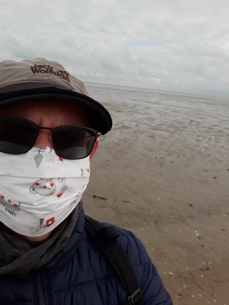 Für den positiven Effekt, den die Maske mir bringt – denn ich bekomme ganz normal Luft – hätte allerdings auch mein Multifunktionstuch gereicht. An diesem Morgen ist es sehr kühl. Der Wind frischt stark auf, und so erweist sich meine Maske auch als Wärmespender. Das aber hat ein jähes Ende, als ich Sie, an der Kugelbake, ablege. Die Strecke zurück, habe ich glücklicherweise Rückenwind und nutze jetzt ich mein Multifunktionstuch, schon allein wegen der ekeligen Kälte.