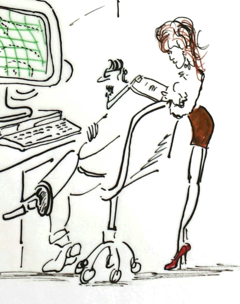 Journalistin Robin Bukowsky bei der Arbeit (aus der Sicht unseres Karikaturisten)