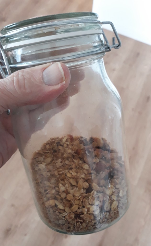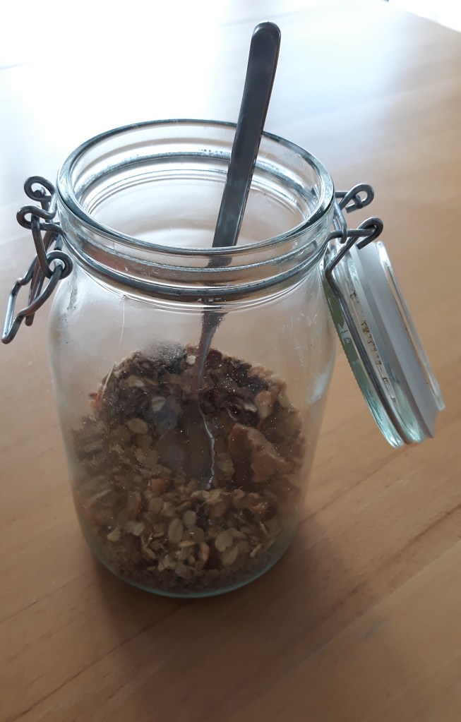- Vom Herd nehmen und abkühlen lassen. Den fertigen Müsli-Mix in eine luftdichte Dose oder ein Glas füllen. Es hält sich trocken gelagert etwa vier Wochen.