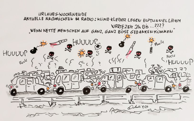 Klima-Kleber in Aktion, Autofahren sind genervt – Wenn nette Menschen auf ganz, ganz böse Gedanken kommen. Friedlich stilllegen (!) was für eine Lüge, denn in Wahrheit stiften die Aktivisten schon seit geraumer Zeit nur noch Unfrieden. Jeder konnte es in den vergangenen Wochen und Monaten sehen, tausende Autofahrer leidvoll miterleben: Die „Letzte Generation“ legt mit ihren zweifelhaften (?!) Aktionen Verkehrswege und Städte nicht einfach „friedlich still“, sie sorgt mit ihren Maßnahmen für Unmut und Zoff.