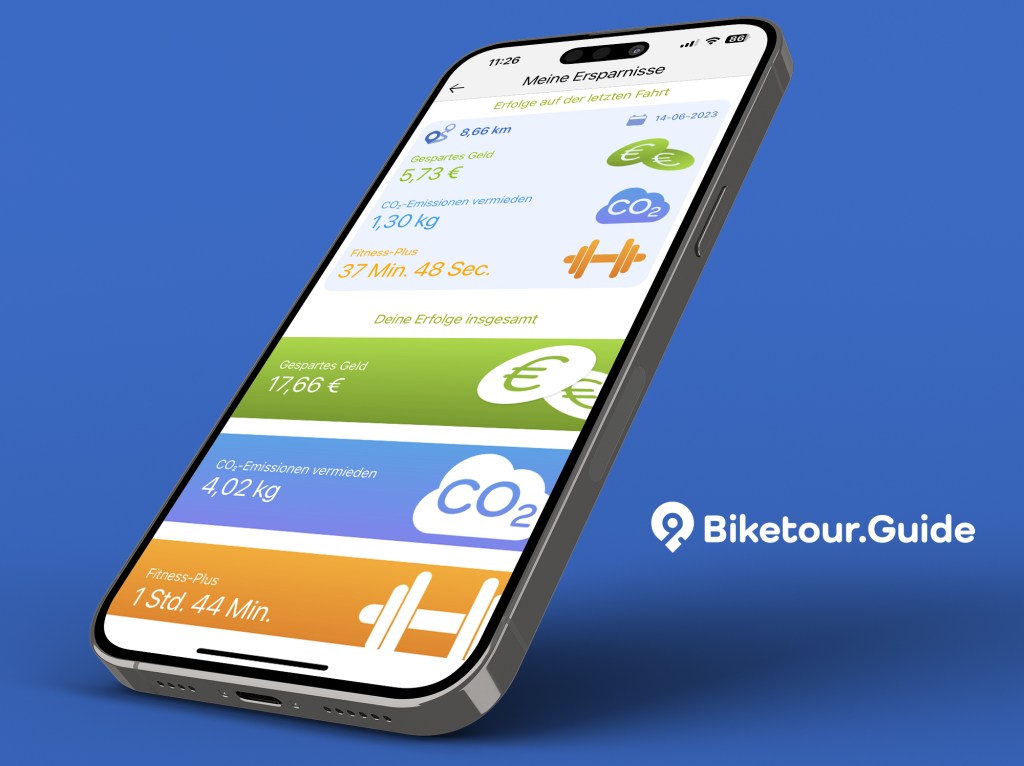 Warum man noch mehr Radfahren sollte, zeigt die App unter „Deine Erfolge“. Hier schlägt fast2work die Brücke zwischen seinen Marken SteigUm.de und dem Biketour.Guide. Welche persönlichen Vorteile der Nutzer bei der letzten Fahrt bzw. über alle bisher gefahrenen Strecken mit dem Fahrrad statt mit dem Auto erradelt hat, veranschaulicht die App in Form von gespartem Geld und CO2-Einsparungen. „Wer mehr über seine persönlichen Vorteile erfahren will, schaut einfach auf SteigUm.de vorbei“, so Conrady.