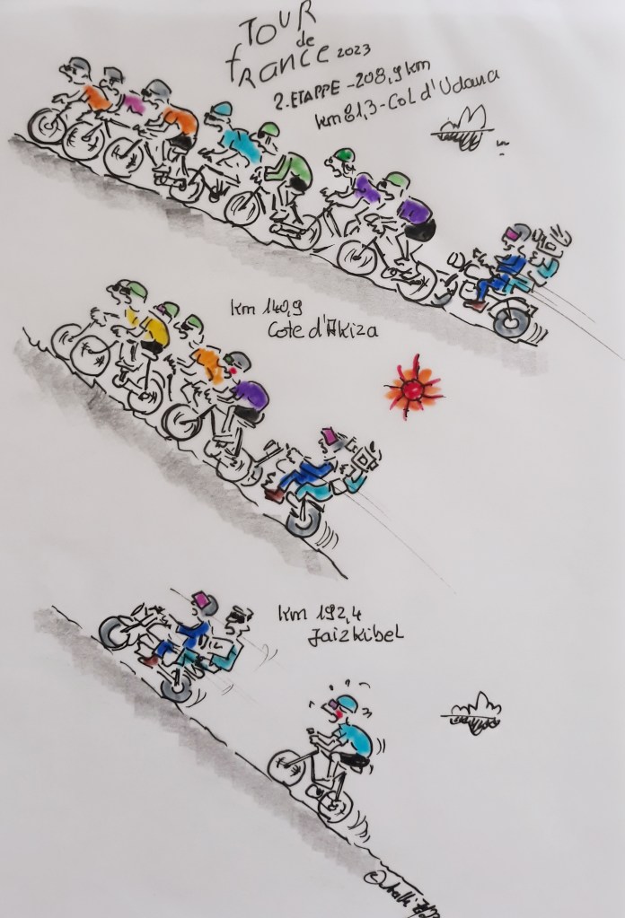 Die Profis der Tour de France 2023 bleiben auch heute im Baskenland. Und das Baskenland bleibt seinem Ruf treu. Es ist wellig. So wellig, dass auch heute kein reiner Sprinter eine Chance auf den Etappensieg haben wird. Nach dem Gipfel des letzten Anstiegs sind es noch 16 Kilometer bis zur Ziellinie. Durchaus möglich, dass sich hier eine späte Fluchtgruppe bilden wird. Wahrscheinlicher ist aber ein Sprint aus einem sehr dezimierten Hauptfeld heraus.