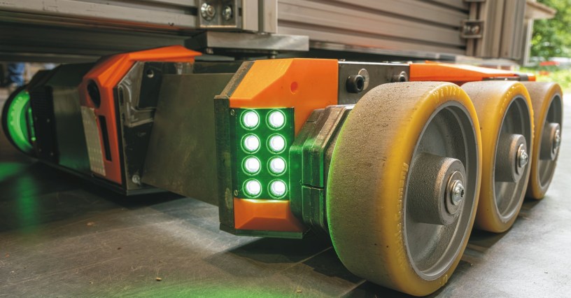 „Unser System besteht aus einer Vielzahl separat angetriebener Fahrzeuge, die im Verbund ein Gewicht von bis zu 40 Tonnen vom Boden anheben und teilautomatisiert versetzen können“, sagt Dr. Maximilian Hochstein vom Institut für Fördertechnik und Logistiksysteme (IFL) am KIT. Der Transport so schwerer Lasten ist durch die Kopplung von bis zu 15 Fahrzeugen möglich. „Diese sind mittels Funk verschaltet und mit Kameras ausgestattet, sodass sie sich selbst koordinieren und synchron agieren“, so Hochstein.