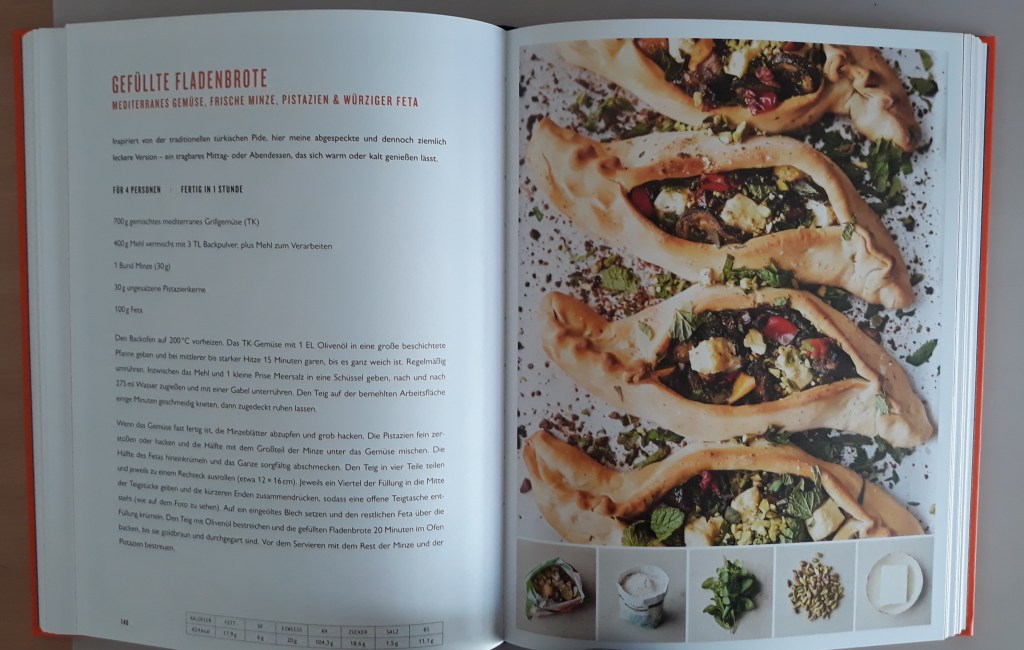 Jedem Rezepte ist eine Doppelseite gewidmet. Meine Augenblicklichen Highlights: Würziges Steak & knusprige Kartoffeln (super), Pikantes Ratatouille-Risotto, und gefüllte Fladenbrote.