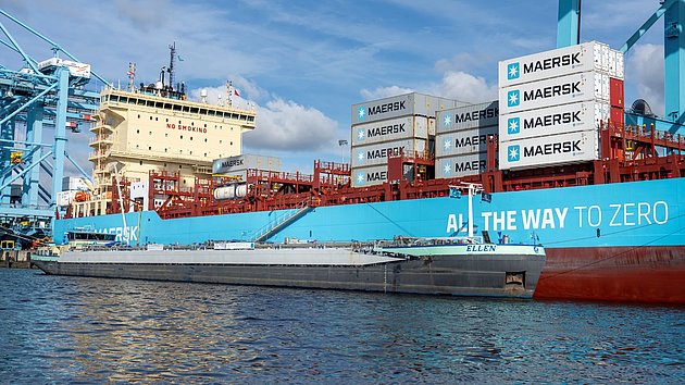 Erstmals hat ein Containerschiff der dänischen Reederei Maersk während der Jungfernfahrt nach Kopenhagen grünes Methanol im Hafen von Rotterdam gebunkert. Das von Hyundai Mipo in Ulsan, Korea, gebaute 172 m lange 2100-TEU-Schiff wurde bei APM Terminals auf der Maasvlakte II von der Bunkerbarge „Ellen“ versorgt.