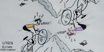 cartulli’s LA VUELTA-Cartoon – Die Königsetappe: 13. Etappe, 8. September – Formigal – Col du Tourmalet – 134,7 km. Es ist ein Tag der Abrechnung. Es stehen mehrere französische Pyrenäen-Pässe im Profil – Col d’Aubsique inklusive hinterher Soulor, Col de Spandelles und zum krönenden Abschluss der Col du Tourmalet, wo auf 2.115 Metern Höhe das Ziel aufgebaut ist.