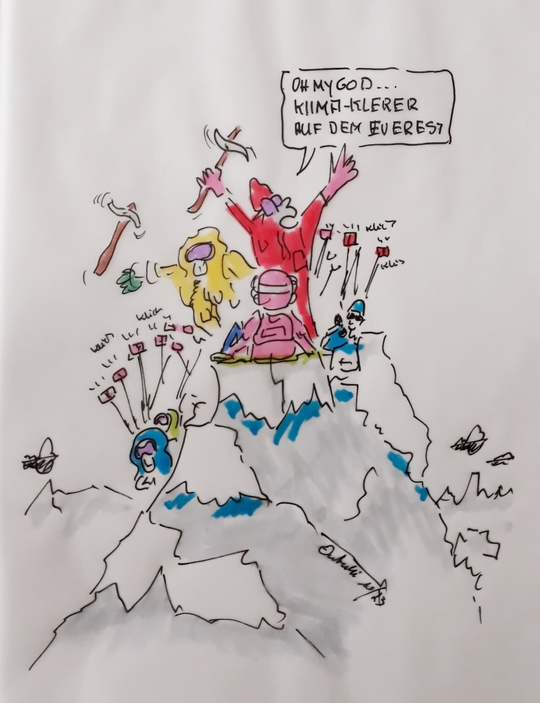 Mount Everest – Massenansturm am Everest: Auf dem höchsten Berg der Welt steht man mittlerweile im Stau – wie auf der A3. 70 Jahre nach der Erstbesteigung wurden bereits für die Frühjahrssaison 250 Permits an ausländische Bergsteigerinnen und Bergsteiger ausgegeben. Offizielle Stellen rechnen aber mit Stau am höchsten Berg der Erde und mutmaßlich allen Gefahren, die dieser mit sich bringt. (Unser Karikaturist zeigt jetzt den Grund des Staus – die Klima-Kleber!!)