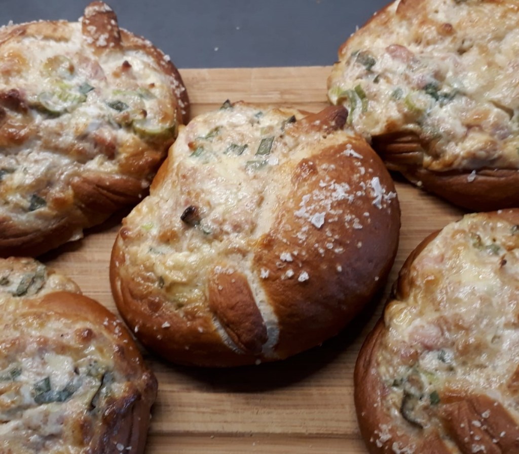 Fertigstellung: Eine Brezel nach der anderen mit Hilfe einer Schaumkelle mit der Oberseite nach unten in die leicht siedende Natron-Lauge geben, ca. 30 Sekunden ziehen lassen und wenden, sodass die Oberseite nun wieder nach oben zeigt. Nochmal 15 Sekunden sieden und dann zurück auf das Blech legen. Mit etwas Fleur de Sel bestreuen. Die vorbereitete Füllung nach Belieben in alle 3 Öffnungen jeder Brezel verteilen. Flammkuchen-Laugenbrezel auf mittlerer Schiene für ca. 20 Minuten goldbraun backen. Zu Beginn der Backzeit einige Eiswürfel auf den Ofenboden werfen, damit Schwaden entstehen. Nach der Hälfte der Backzeit das Blech drehen. Nach dem Backen die Flammkuchen-Laugenbrezel mit den geschnittenen Lauchzwiebeln ausgarnieren.