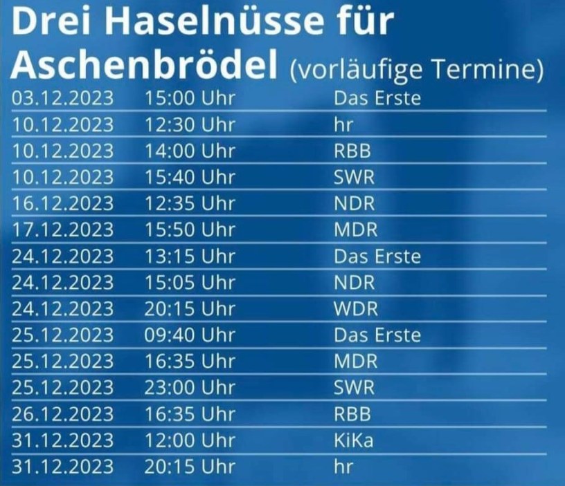 Wann kommt „Drei Haselnüsse für Aschenbrödel“ 2023 im Fernsehen? Welcher Sender zeigt das Märchen? Zu welcher Uhrzeit? Hier alle Sendetermine und Zeiten in der Übersicht, sobald sie bekannt sind.