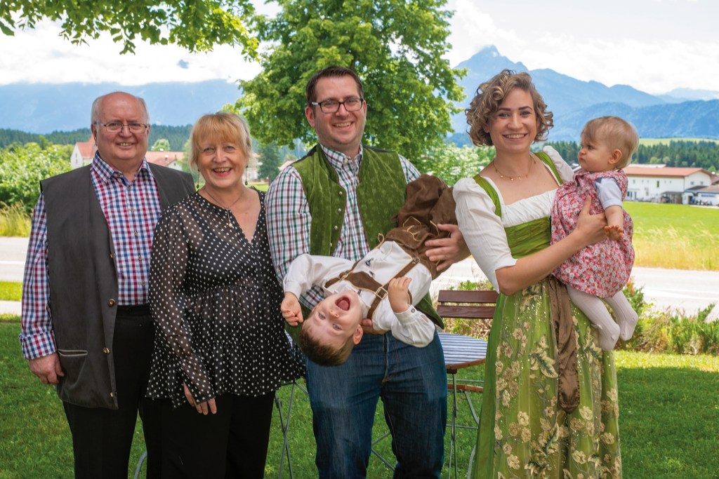 Das Landhotel Gockelwirt ist ein Haus mit einer reichen Tradition – seit mehr als 100 Jahren ist das Hotel in Familienbesitz. Michael und Elisa Steinacher führen das 4-Sterne-Hotel bereits in der sechsten Generation. Unser Bild zeigt das Ehepaar mit seinen Kindern Emilian und Marie. Außerdem im Bild zu sehen sind links die Eltern des Hotelchefs, Josef und Barbara Steinacher.