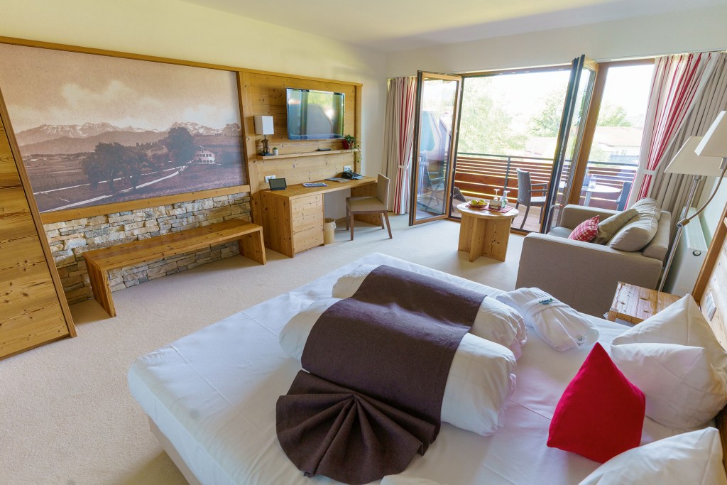 Die Panoramazimmer des Landhotels Gockelwirt sind größtenteils mit Zirbenholz verkleidet und bieten Gästen einen wunderbaren Blick auf das verschneite Bergpanorama des Ostallgäus. Foto: Björn Hänssler