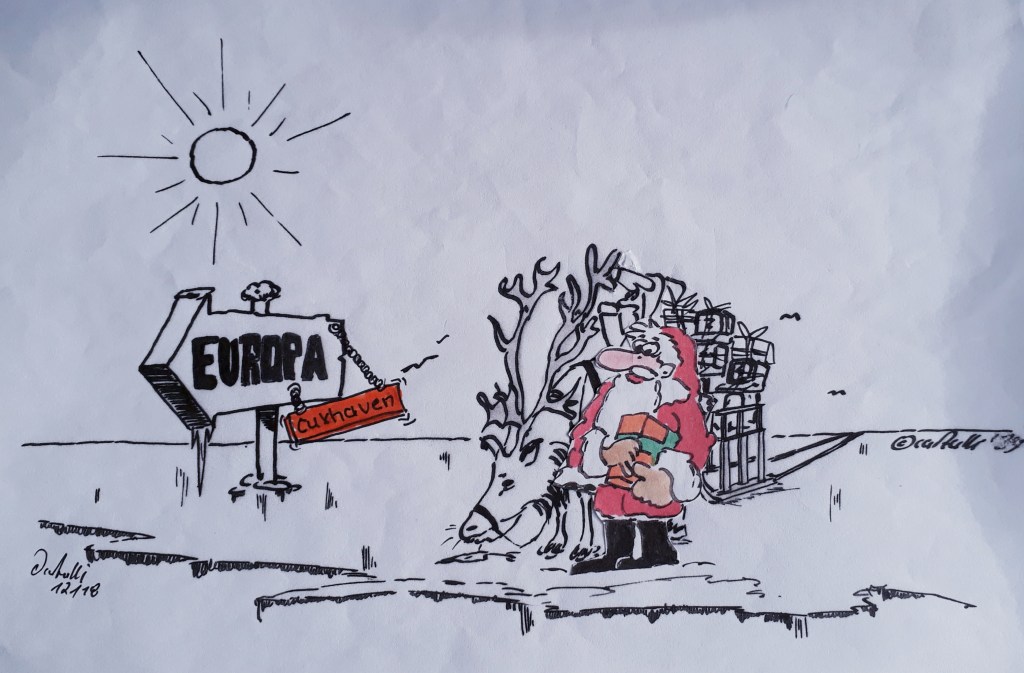 1. Advent: Der Weihnachtsmann hat sich, aus dem „Hohen Norden“ auf den langen Weg nach Cuxhaven gemacht. Hier ein Bild vom ersten Zwischenstopp an der Packeiskante.