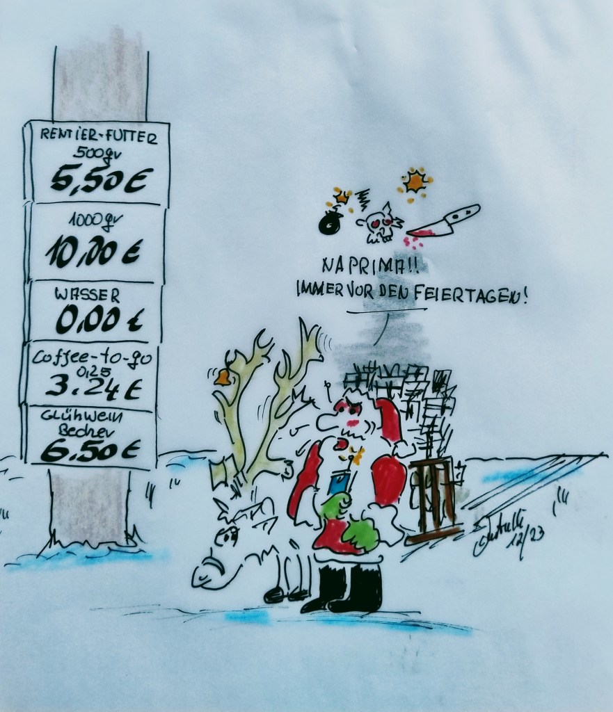 2. Advent: Hier ein neues Bild vom Weihnachtsmann, auf seinem langen Weg – es gibt Probleme.