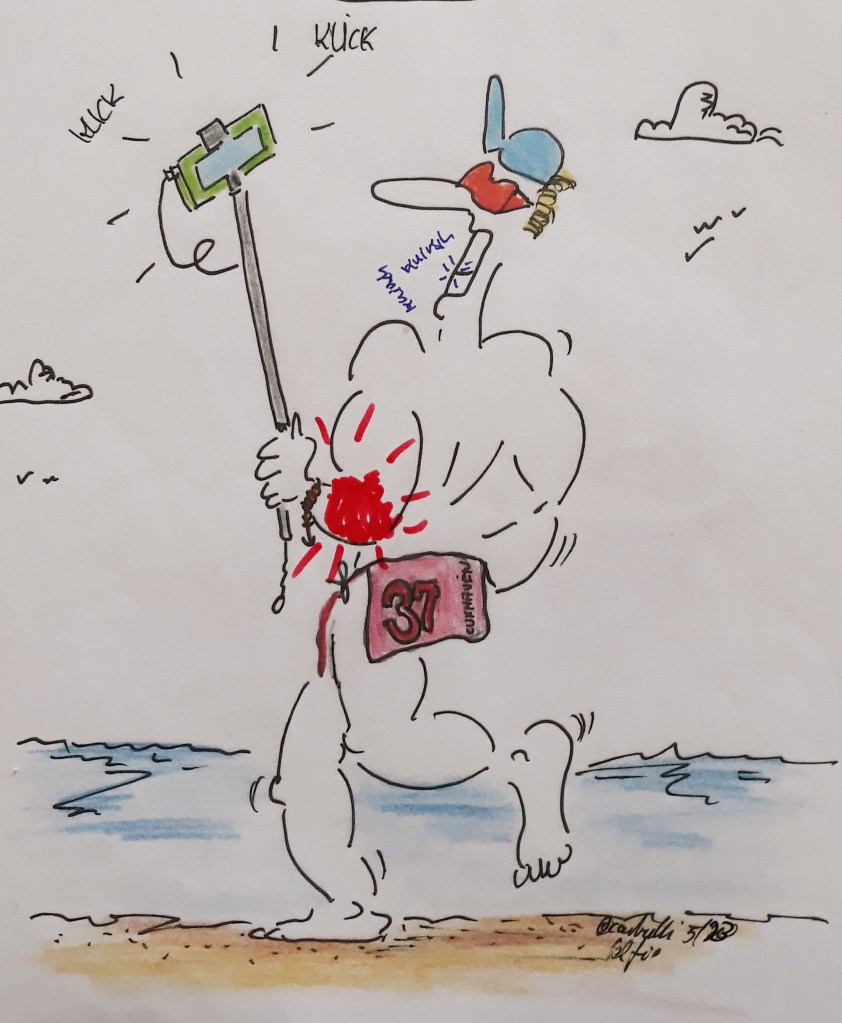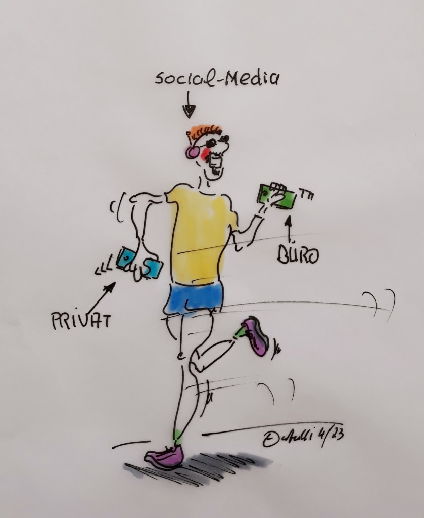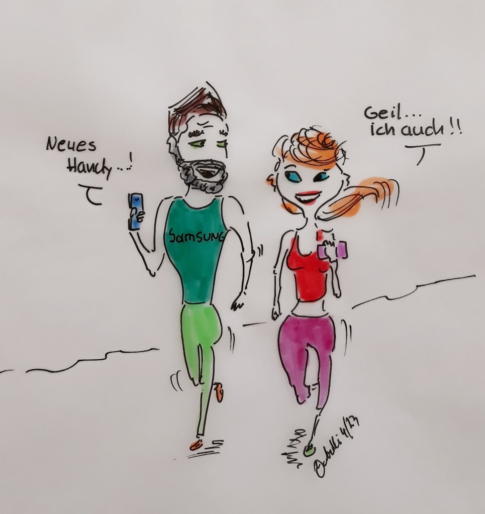 Handy in der Hand? Riskant! Und trotzdem, immer wieder wird in den Aufmacher-Bilder von Laufzeitungen, oder in Sportanzeigen, damit geworben.