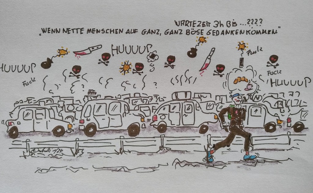 Auf Streik folgt Streik – und noch ein Streik. Diesmal sind es nicht die Klima-Kleber, die Nerven. Diesmal sind es die Bauern und ihre Traktoren, der GDL-Bahn-Streik, der Warn-Streik der ÖPNV, ach ja nicht zu vergessen die Piloten, und die Sicherheitsmitarbeiter am Flughafen. Autofahren sind genervt– Wenn nette Menschen auf ganz, ganz böse Gedanken kommen.
