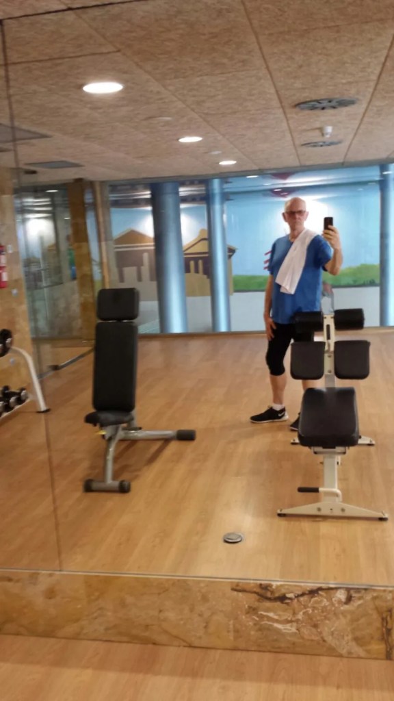 Nachdem ich mich dann zum Aufwärmen (!!) auf dem Laufband – 60‘ in hohem Tempo – warm gelaufen habe, geht’s zu den (richtigen ??) Geräten. Um dort dann auf einen freien Platz zu warten. Bis man dann irgendwann an der Reihe ist und das mitgebrachte Handtuch vorbildlich auf dem Gerät ausbreitet, wodurch man einerseits klarmacht, dass man das Gerät ganz sicher nicht vollschwitzen wird.