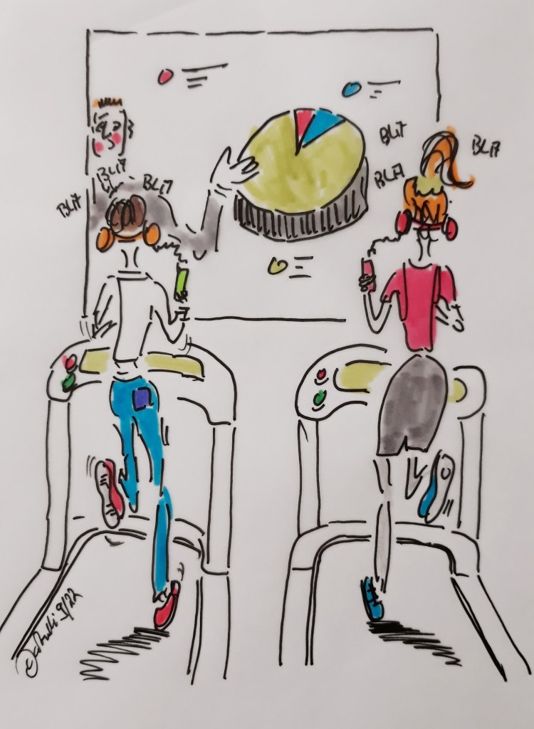 Ich suche mir einen freien Spind, wische das Proteinpulver, welches überall in der Umkleide verteilt ist, von der Sitzbank und ziehe mich um – professionelle, schweißabweisendr, atmungsaktive, ergonomische Sportswear. Fertig umgezogen bereite ich mich mental auf das vor, was mir gleich bevorsteht: der Gang vorbei an den verschwitzten Sportler*innen, vorbei an den Blicken der Trainer*innen, hin zum Laufband.