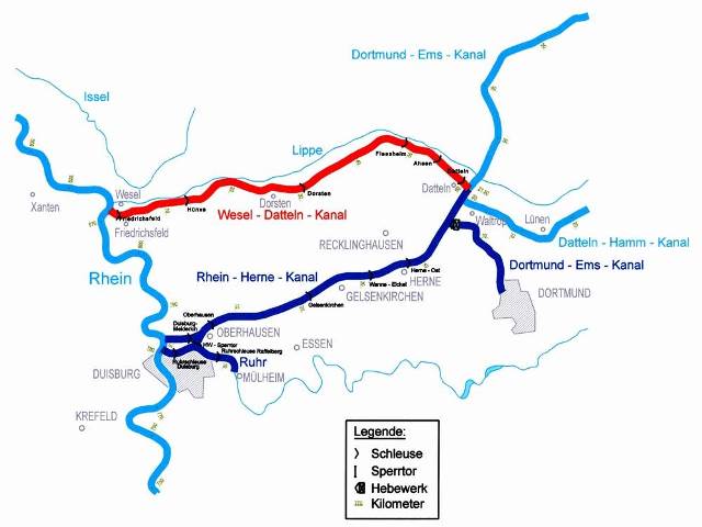 Der Datteln-Hamm-Kanal ist Teil des Lippe-Seitenkanals. Er begleitet das linke Ufer der Lippe von Hamm-Uentrop bis Wesel und geht dann in den Rhein über. Er hat eine Breite von 31 Meter, ist 8 Meter tief und hat eine stolze Länge von 107,3 Kilometern. Der Kanal ist in zwei Hauptteile unterteilt. Der östliche Teil zwischen Datteln und Hamm ist 47 Kilometer lang und hat zwei Schleusen. Der Lippe-Seitenkanal ist wichtig für den Massengüterverkehr des nördlichen Ruhrgebietes, ferner versorgt er das westliche Kanalnetz mit Wasser aus der Lippe und aus dem Rhein.