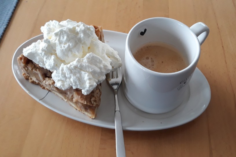 Meine Frau hat mich mal wieder überrascht, mit einem selbstgebackenem Apfelkuchen mit Sahne, und einen Pott „hot strong coffee“. Himmlisch, was braucht man mehr zum glücklich sein – na klar, selbstverständlich auch meine Frau.