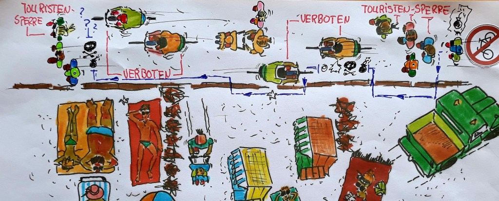 „Och, das ist ja schön, dass hier alles frei ist“, denkt sich so mancher Tourist und spaziert, nach links und rechts guckend, oder steht, gern nach oben schauend, mitten auf dem Rad- und Gehweg. Wie beispielsweise hier in Cuxhaven in der Grimmershörn Bucht, aber auch auf der Strand-Promenade Duhnen zur Kugelbake. Die „Ich hab‘ Platz“-Idylle ist schnell kaputt, wenn er den auf sich zufahrenden Radler erblickt. Und der, gestresst von Job, Leben, sowie Touris, und sich unverwundbar fühlend dank Helm, Hornbrille und Treckingbike-Ausstattung, denkt nicht dran zu bremsen, sondern schreit, klingelt, schimpft. Der Urlaub ist für diesen Tag gelaufen!