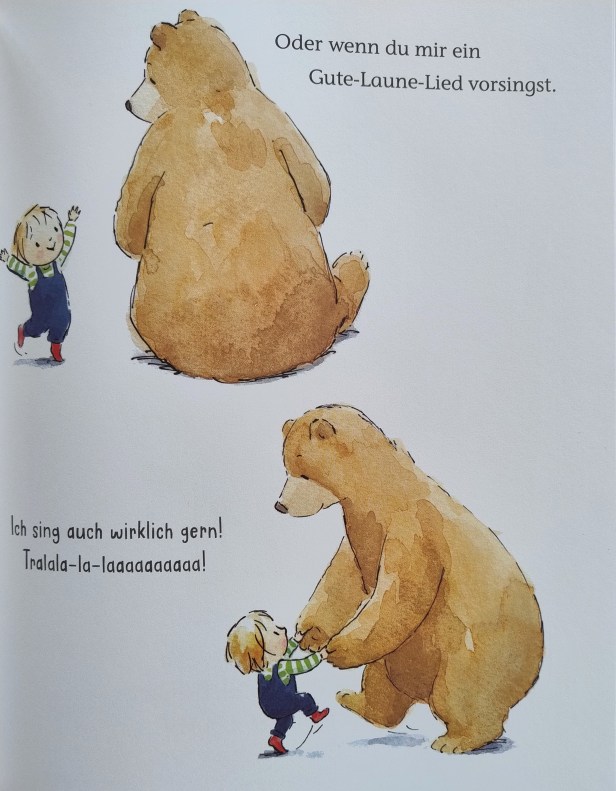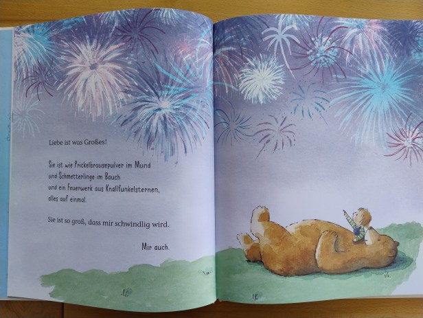 Warum ich das Buch empfehle: Unter dem Titel „Liebe in den kleinen kleinen Dingen“, ist jetzt ein tolles Bilderbuch erschienen. Wunderschön geschrieben von Stella J.Jones und zauberhaft von Jane Massey illustriert. Es ist ein perfektes Geschenk für einen Menschen, den man liebt. Das Tolle dabei, das Kind und der Bär sind zwei wirklich klasse Botschafter der Liebe. Das Buch hat wenig Text, pro Doppelseite 2-4 Zeilen, aber dafür viele der wunderbaren Illustrationen, an denen man sich nicht sattsehen kann.