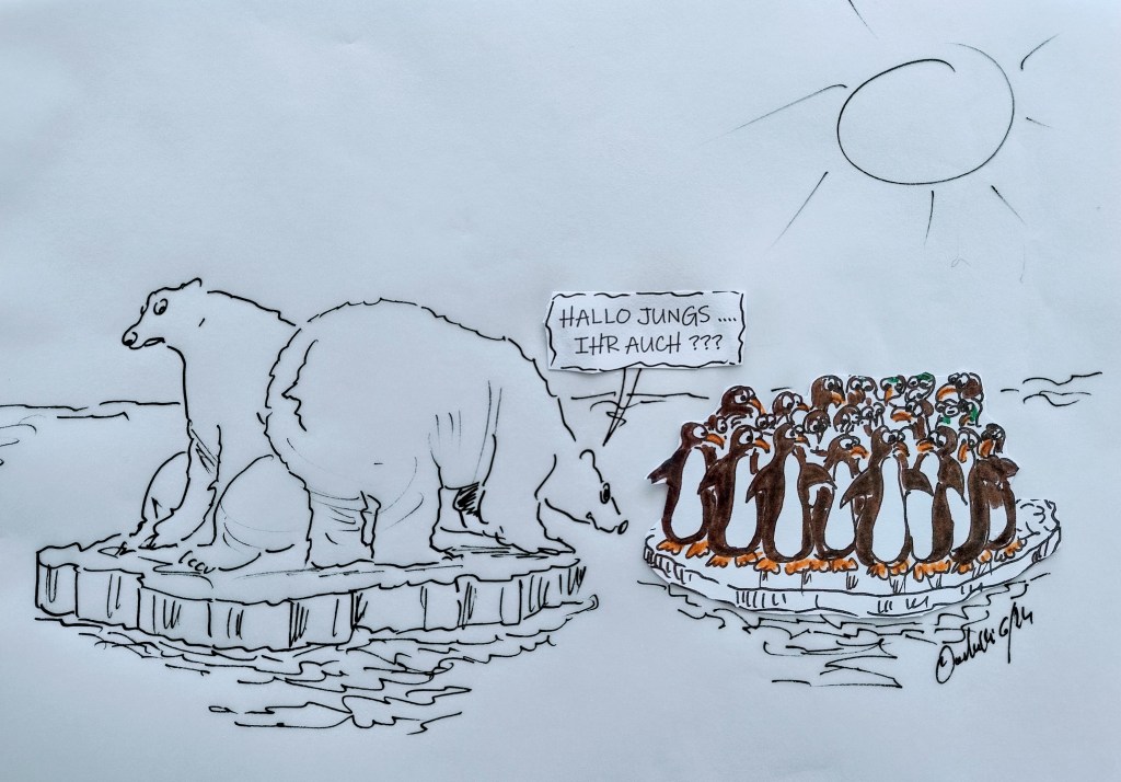 Die Klimakrise eskaliert. Auf dem Gotthardpass liegen Ende Mai nur noch 8 Meter (!?) Schnee. Ohne den Klimawandel wären es 50 Meter gewesen. Der Lebensraum von Eisbären und Pinguinen wird immer kleiner.