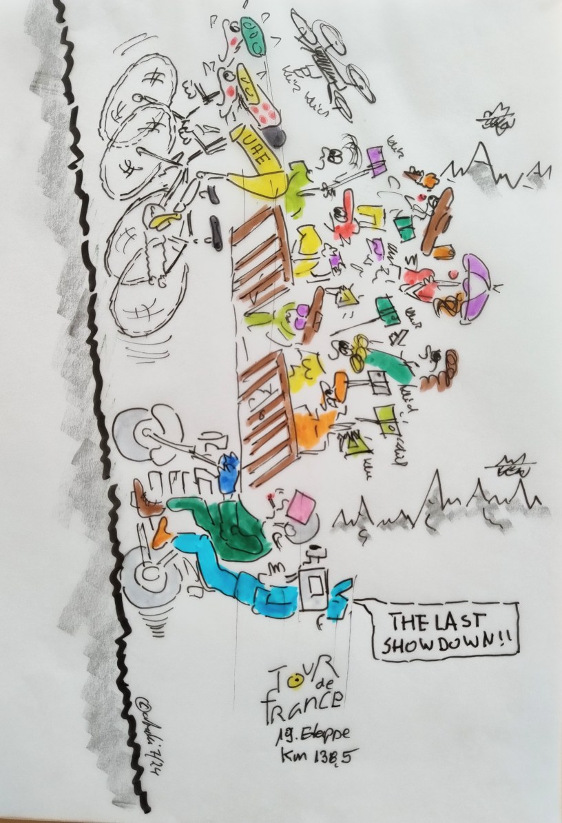The Last Showdown: Es geht am drittletzten Tag der Tour 2024 hoch hinaus. Drei schwere Anstiege bei einer recht kurzen Etappe. Alle drei haben den Gipfel jenseits der 2000er Marke. Die dünne Luft wird eine große Rolle spielen. Denn im Zusammenspiel mit der immer größer werdenden Erschöpfung gelangen die Sportler an die Belastungsgrenze. Schon der erste Anstieg ist lang, auch wenn nicht supersteil. Eine lange Abfahrt gibt es nicht, mit Flachstück sind es nur 20 Kilometer bis zur nächsten Steigung. Wieder eine Stunde bergauf, den Großteil in mehr als 1500 Metern über Meeresspiegel. Der Gipfel des Anstiegs liegt bei 2802 m üNN. Das bedeutet: Satte 800 Höhenmeter erklettern, in >2000m Höhe. Ein Brett! Es folgt eine lange Abfahrt und wieder geht es hoch auf 2000 Meter üNN. Nach Isola 2000 ins Ziel.