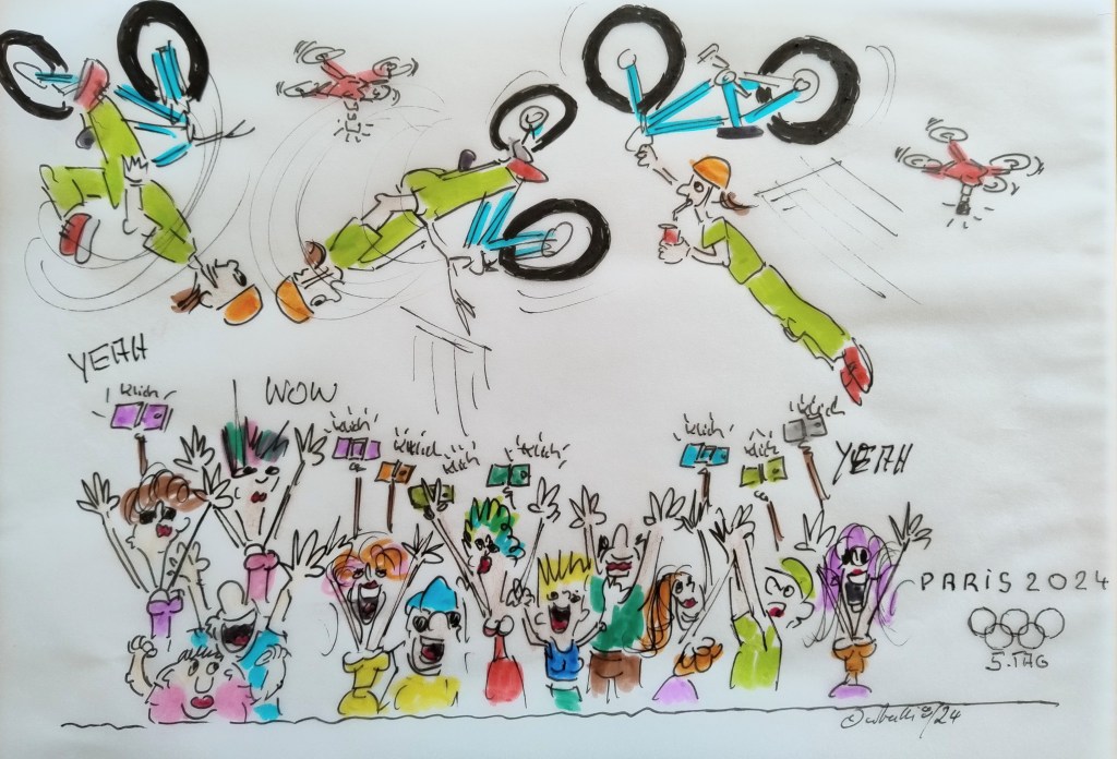 cartulli’s Olympia-Paris 2024-Cartoon: Heute 5. Tag, Mittwoch 31.07.24 BMX Freestyle: BMX–Freestyle umfasst die Disziplinen im BMX-Sport, bei denen es um akrobatische Sprünge und kreative Tricks, den dazu benötigten Mut, die Geschicklichkeit und Radbeherrschung geht.