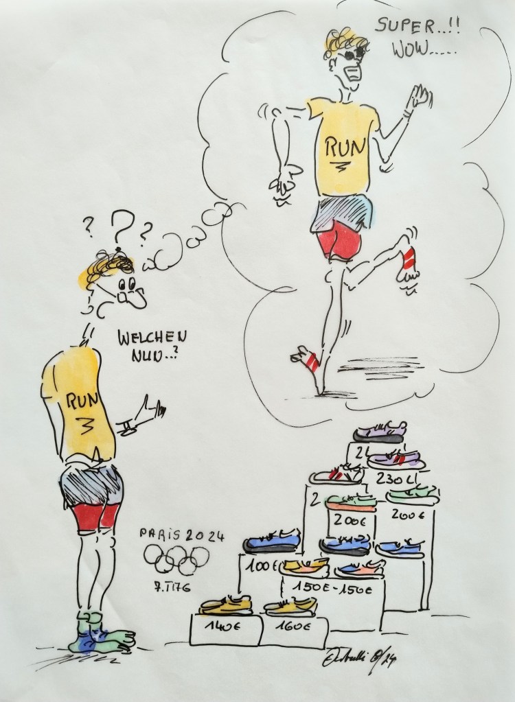 cartulli’s Olympia-Paris 2024-Cartoon: Heute 7. Tag, Freitag 02.08.24 – 10.000 Meter Männer: Die längste Distanz innerhalb des Stadion ist einer der Höhepunkte im Stade de France an diesem Abend. 25 schweißtreibende Runden muss das Feld absolvieren.