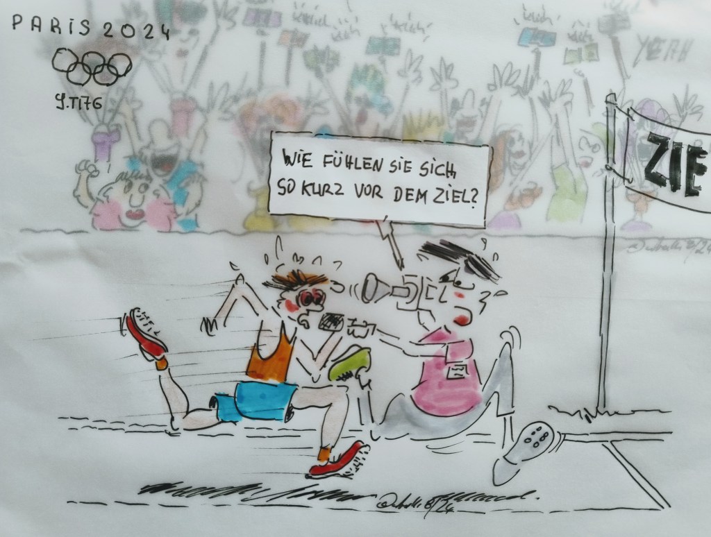 cartulli’s Olympia-Paris 2024-Cartoon: Heute 9. Tag Sonntag 04.08.24 – 100 m Sprint der Herren ab 21:55: Wer ist der schnellste Mann der Welt?
