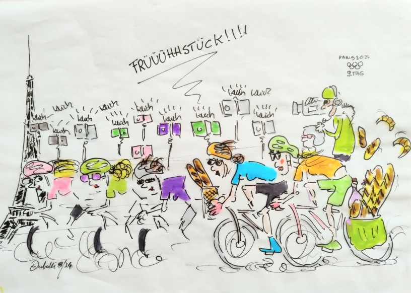 cartulli’s Olympia-Paris 2024-Cartoon: Heute 9. Tag Sonntag 04.08.24 – Straßenradrennen der Damen 14:00 Uhr.
