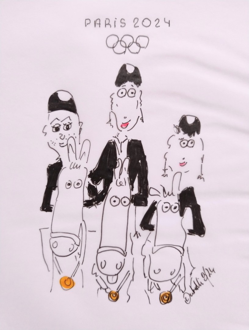 cartulli’s Olympia-Paris 2024-Cartoon: Samstag 04.08.2024: Deutschland gewinnt Team-Gold in der Dressur. Am Ende wurde es allerdings knapp. Gerade einmal 0,121 Punkte trennten Frederic Wandres (Hagen a.T.W.) mit Bluetooth OLD und Isabell Werth (Rheinberg) mit Wendy und Schlussreiterin Jessica von Bredow-Werndl (Aubenhausen) mit TSF Dalera BB (235,790 Punkte) von den zweitplatzierten Dänen (235,669 Punkte). Die Bronzemedaille ging nach Großbritannien (232,492 Punkte).