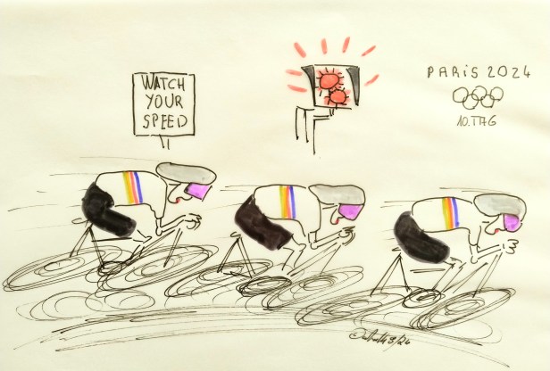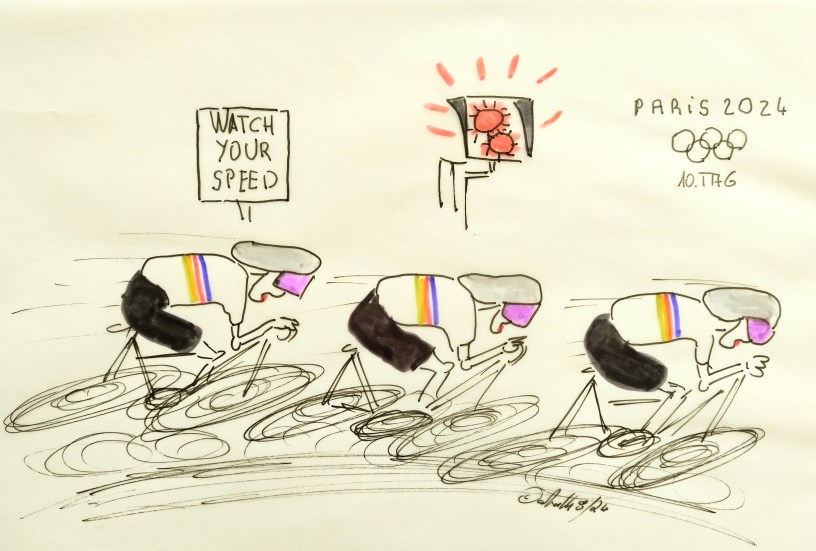 cartulli’s Olympia-Paris 2024-Cartoon: Heute 10. Tag Montag 05.08.24 – Bahnrad Teamsprint Frauen: Das Finale der Bahnrad-Fahrerinnen im Teamsprint steht an. Die deutschen Sprinterinnen gehen als Favoritinnen auf die Bahn.