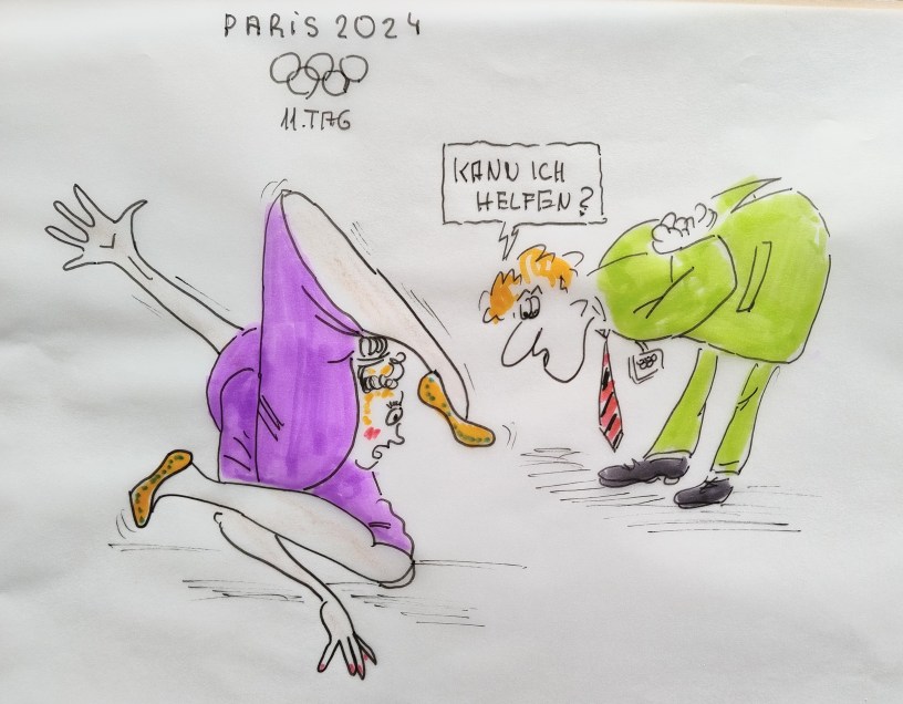cartulli’s Olympia-Paris 2024-Cartoon: Heute 11. Tag Dienstag 06.08.24 – Bei der Rhythmischen Sportgymnastik werden Elemente des traditionellen Tanzes und der Gymnastik kombiniert. Dabei können vier Geräte verwendet werden: Band, Reifen, Ball und Keulen. Auch die Musikauswahl hat einen großen Einfluss auf die finale Bewertung. In jeder Einzeldisziplin treten die Turnerinnen einmal auf. Die insgesamt vier Aufführungen gehen jeweils 75 bis 90 Sekunden lang. Das Gesamtergebnis setzt sich dann aus drei Komponenten zusammen.