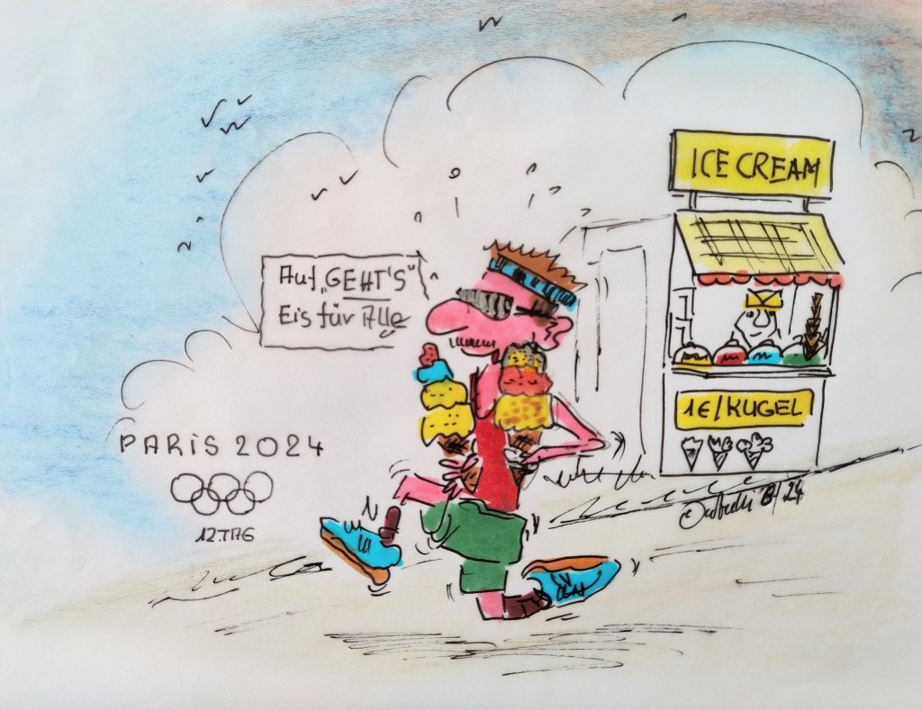 cartulli’s Olympia-Paris 2024-Cartoon: Heute 12. Tag Mittwoch 07.08.2024 – 20 km Gehen Mixed, Finale – Für Deutschland absolvieren Saskia Feige und Christopher Linke die Strecke