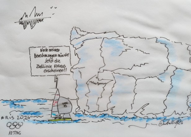 cartulli’s Olympia-Paris 2024-Cartoon: Heute 12. Tag Mittwoch 07.08.2024 – Segeln 470er Mixed – Finale ab 12:00 Uhr. Premiere vor Marseille. Erstmals wird die 470er-Jolle im Mixed gesegelt, seperate Damen- und Herren-Regatten entfallen.