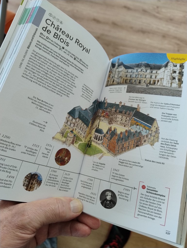 Unterteilt in 6 Kapitel präsentiert sich das Loire-Tal Region für Region – mit fundierten Inhalten sowie interessanten Highlights aus Kultur und Natur. Dazu gibt es was BESONDERES: 3-D-Zeichnungen bieten aus der Vogelperspektive ganz neue und einmalige Einblicke in die wunderschönen Loire-Schlösser – wie das Château d’Angers, das Château de Chenonceau, das Château d’Azay-le-Rideau und das Château de Chambord. Ob zur Einstimmung auf den Besuch oder als handlicher Begleiter unterwegs, die Darstellungen lassen Sie die Schönheit der historischen Gebäude völlig neu erleben. Habe ich so bisher in keinem Reiseführer gefunden – SUPER. Ich bin begeistert.