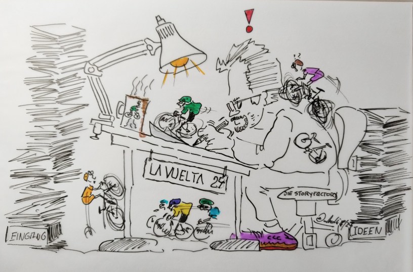 La Vuelta 2024: Nach der Olympiade, und der Tour de France der Frauen, berichten wir, die Storyfactory und das Cuxhaven-Cartoon-Center, auch über die Vuelta 2024 (17. Aug. bis 08. Sept.). Es wird aber diesmal keine 21 Karikaturen (21 Etappen) geben. Wir haben uns einige interessante Etappen herausgesucht, die wir – wie üblich – mit einer Karikatur, sowie Hinweise zum Etappen-Verlauf ausstatten. Lasst euch überraschen.