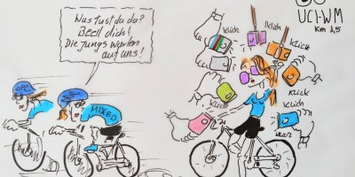 cartulli’s UCI Radsport-WM-Cartoon: Eliterennen der Frauen über 154, 1 km, am Samstag den 28. September. Es geht über 154,1 km mit 2.384 Höhenmetern.