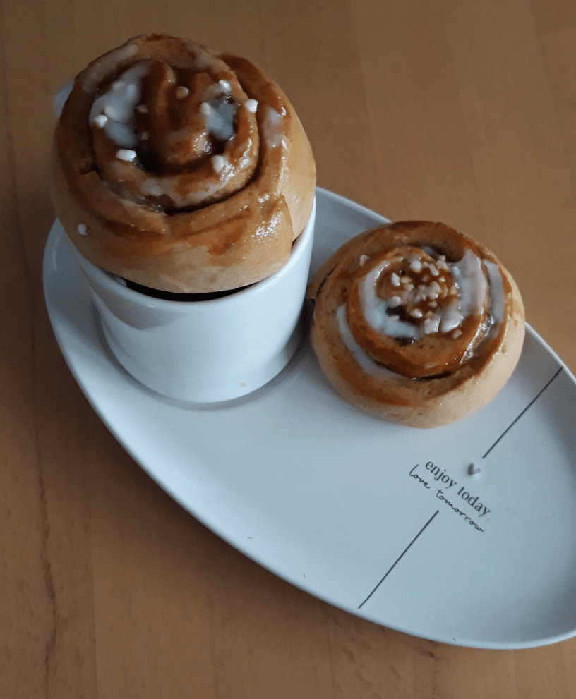 Zwei selbst gebackene Zimtschnecken, ein Becher Kaffee: Mehr braucht es wirklich nicht für die tägliche Portion Glück. Ein Seelenschmaus!