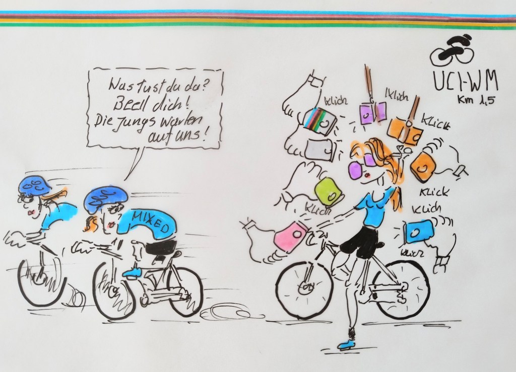 cartulli’s UCI Radsport-WM-Cartoon: Mannschaftszeitfahren Mixed Relay Männer/Frauen über 53,7 km am Mittwoch den 25. September. Die erste Runde wird von drei Männern gefahren, die zweite von drei Frauen desselben Landes. Die Runde beträgt 26,8 km mit 501 Höhenmetern.