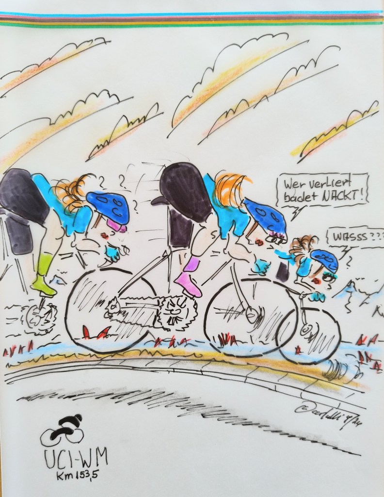 cartulli’s UCI Radsport-WM-Cartoon: Eliterennen der Frauen über 154, 1 km, am Samstag den 28. September. Es geht über 154,1 km mit 2.384 Höhenmetern.