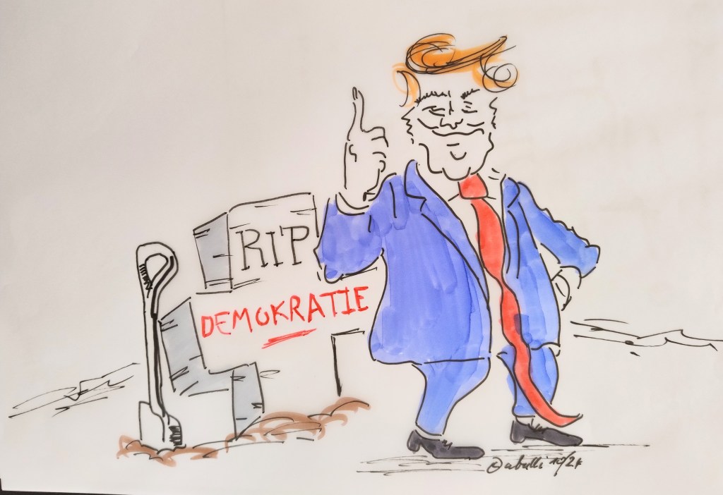 Trump könnte zum Totengräber der Demokratie werden: Die Demokratie der Vereinigten Staaten sieht sich mit einer zweiten Amtszeit Donald Trumps konfrontiert. Konnte sie den ersten „Stresstest“ angeschlagen überstehen, so sind die Herausforderungen seitdem angewachsen. Donald Trump plant unverhohlen eine radikalere zweite Präsidentschaft. Vier Jahre lang hat ein durchgeknallter Horror-Clown ein ganzes Land (und die Welt) ins Chaos gestürzt. Jetzt ist das Grauen zurück. Donald Trump unternimmt einen weiteren Versuch, Präsident zu werden. Gott behüte uns vor dieser Wiederwahl im November!!!