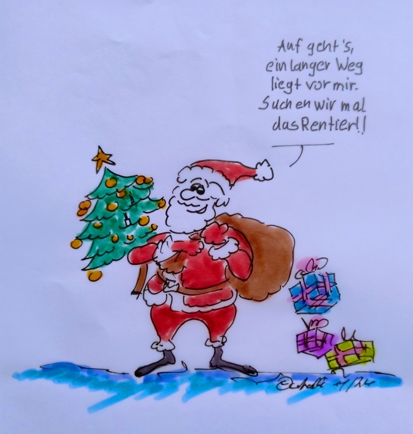 24.11.2024 – Alle sind in den letzten Vorbereitungen, und der Weihnachtsmann: „Auf geht’s, ein langer Weg liegt vor mir. Suchen wir mal das Rentier.“