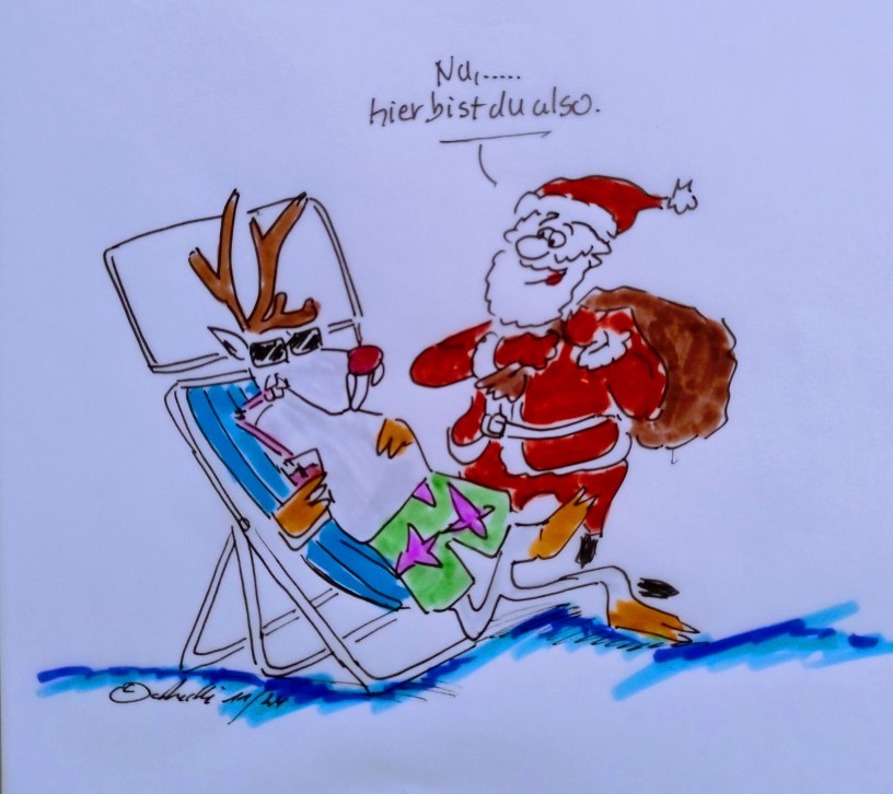 Der Weihnachtsmann auf dem Weg nach Cuxhaven. 24.11.2024 – Alle sind in den letzten Vorbereitungen, und der Weihnachtsmann: „Auf geht’s, ein langer Weg liegt vor mir. Suchen wir mal das Rentier.“