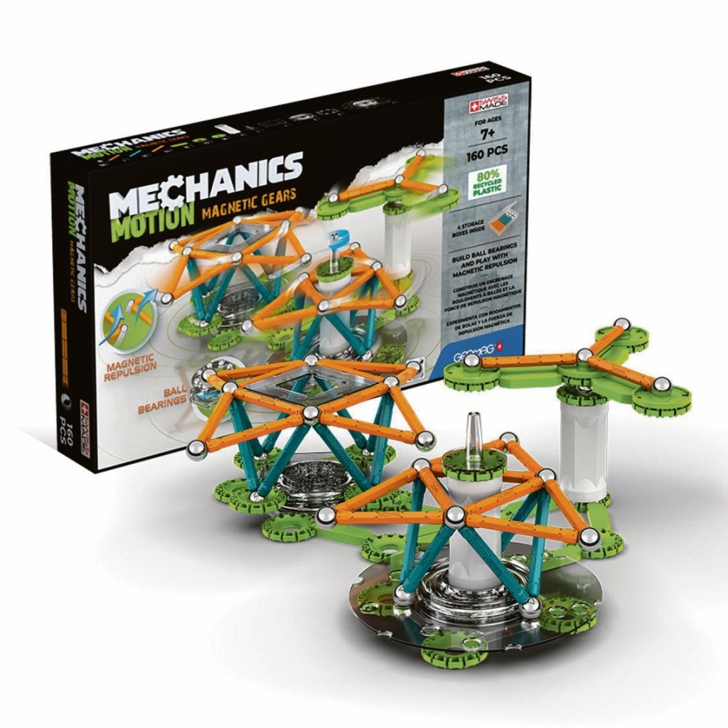 Hersteller Geomag bringt mit Mechanics Motion Gears 3 Bewegung in die Welt der magnetischer Konstruktionssets. Der Baukasten ergänzt die klassische Magnetkonstruktion um mechanische Elemente wie Wälzlager. Nicht nur Kinder ab sieben Jahren können damit Modelle bauen, die sich mithilfe von Magnetkräften bewegen. Mit den 160 Teilen lassen sich laut Hersteller beispielsweise ein Aufzug, eine magnetische Abschussvorrichtung und ein Schwerkraftmotor bauen. Das Qualitätsspielzeug aus der Schweiz kostet rund 70 €.