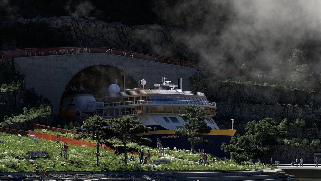 Visualisierung eines Schiffs beim Verlassen des Tunnels (Source: Kystverket/ Multiconsult /LINK Arkitektur)