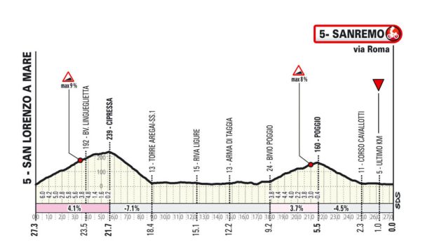 Die Strecke mit Startort in Pavia führt über 299 Kilometer, die berühmten drei Capi sowie die Schlussanstiege Cipressa und Poggio auf die Zielgerade Via Roma in Sanremo.